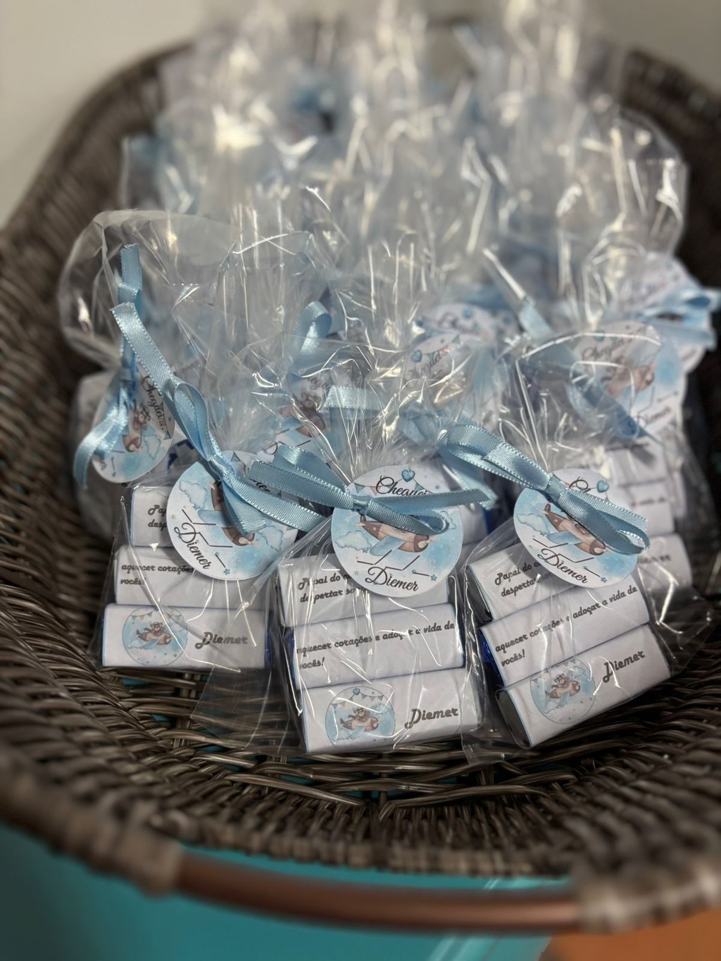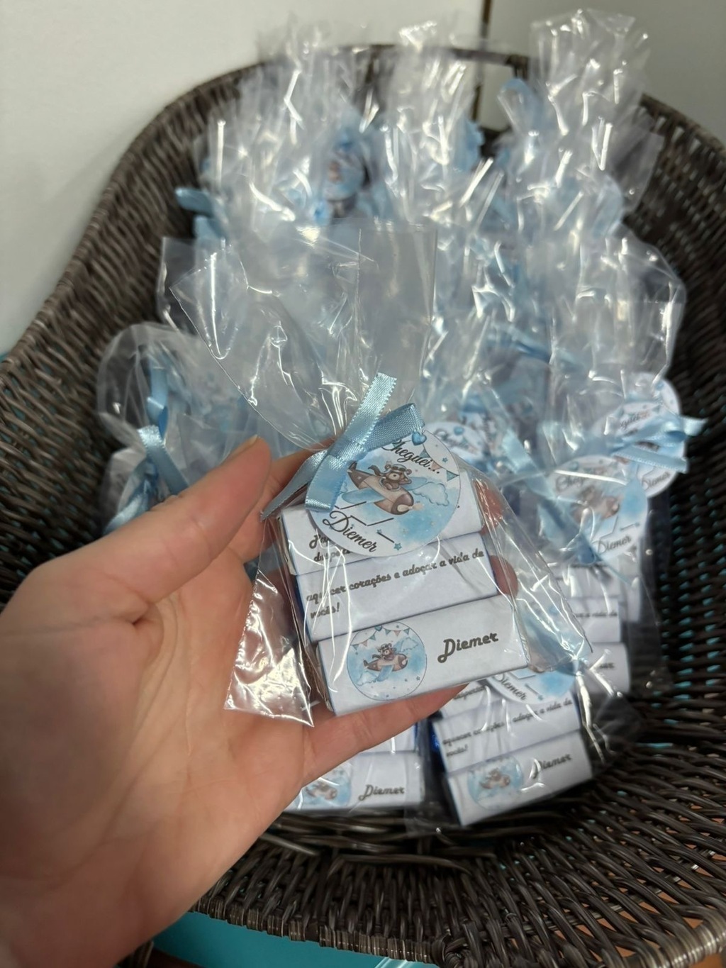 Lembrancinha de nascimento feita com carinho: um saquinho com 3 Bis personalizados para celebrar a chegada do pequeno com doçura e delicadeza.